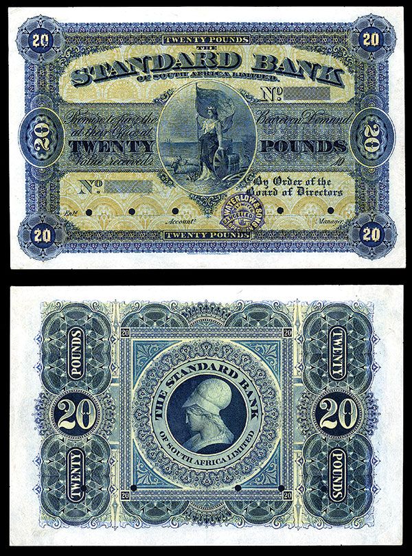 South Africa, 19xx (1900's), 20 Pounds, Similar to P-S584, Color Trial Specimen printed in blue with gold underprint as well as a blue back, the issued note had black border on blue and yellow underprint, Waterlow imprint at bottom, Standing Britannia with flag, shield and sheep in middle, AU to Choice AU condition due to mis-handling of the top left corner, Very small Waterlow & Sons, Ltd. imprint on bottom middle border area. W&S.