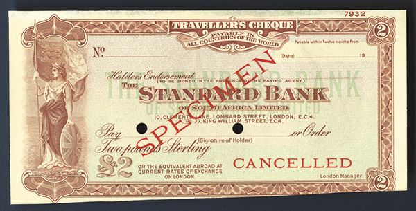 South Africa, 2 Pounds, Specimen check, Brown on light green, standing Liberty with shield on left, Specimen overprint, POC, mounting remnants on back top margin otherwise the check seems in AU to Uncirculated Condition. W&S. First time seen bay cataloger.