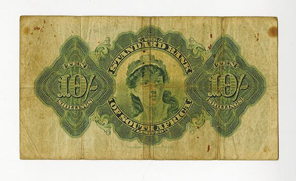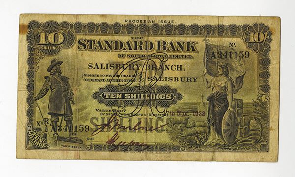 Rhodesia, 1933, 10/- Shillings, P-S146b, Issued banknote, Black, green and orange, Britannia at right, Van Riebeck at left, S/N A341159, Very Fine with small stain on upper left margin. W&S.