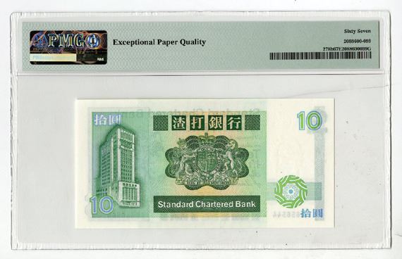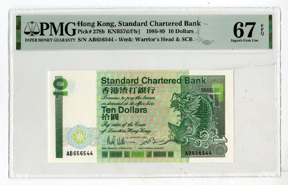 Hong Kong, 1988. 10 Dollars, P-278b, KNB57d/f/h/j, Issued Banknote, Green on m/c underprint with koi fish at right, S/N AB65644, PMG graded Superb Gem Uncirculated 67 EPQ.