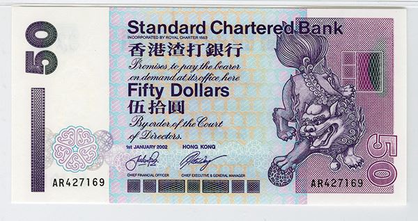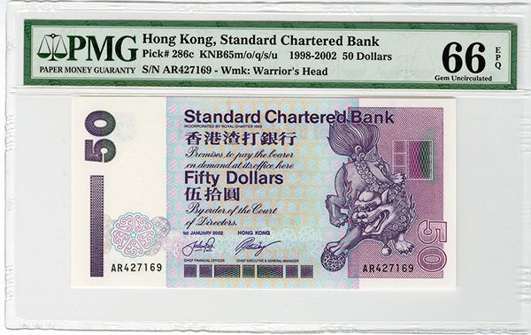 Hong Kong, issued 50 Dollars, 2002, P-286c, KNB65m/o/q/s/u, PMG graded Gem Uncirculated 66 EPQ.