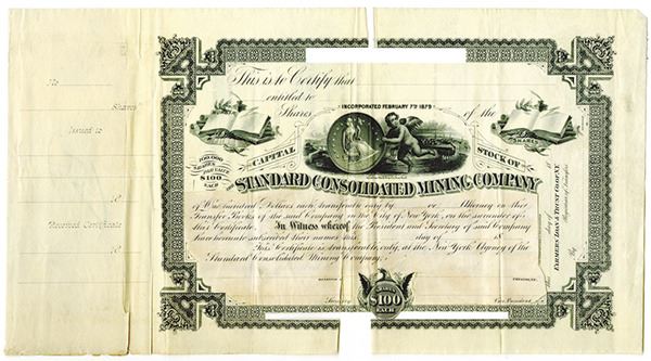 Bodie, California. Lot includes 2 pieces: Odd Shares Specimen Capital Stock Certificate in Fine condition with elements cut out and removed; also includes new text that is cut out which can be placed over the proof stock certificate to exhibit the requested changes. Exceptional Coin vignette in middle with cherub holding onto 1879 dated gold coin, Standard Consolidated Mining was located in Bodie, California, which became a boom town in 1876 after the discovery of a profitable line of gold. The town went into decline in the subsequent decades and came to be described as a ghost town by 1915. The U.S. Department of the Interior recognizes the designated Bodie Historic District as a National Historic Landmark. ABNC.