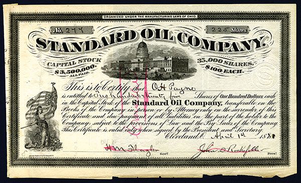 Ohio. Standard Oil Co. 225 Shares I/C Stock. #277. This historic document has an ornate border around it with a vignette of the U. S. Capitol and patriotic vignette of a woman brandishing a sword and a large American flag. The Standard Oil Company preceded the Standard Oil Trust Company. Fine condition with some creases from folding and minor wear around the edges with small chips out of extra wide lower border that could be trimmed if desired. Maverick, Stephan & Co. Original John D. Rockefeller signature as president and Henry M Flagler as Secretary. Certificate from the Standard Oil Company printed in 1870 when the company was founded but issued in 1881.