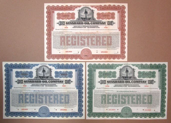 New Jersey, 1926. Lot of 3 Registered Twenty Five Year 5% Gold Debenture Specimen Bonds in different colors and denominations, includes: $1000 in Brown, $5000 in Blue, and $10,000 in Blue. All have gushing oil well at top, Specimen overprints and POCs, are in VF to XF condition, ABNC. (3). Sold "AS IS" no returns accepted. Attractive and rare bonds from this historic company.