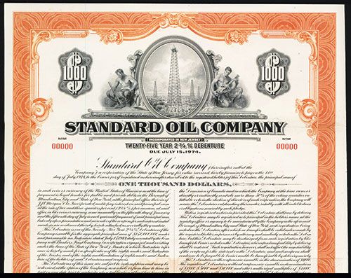 New Jersey, 1949, $1000, 25 Year 2 3/4% Debenture, Specimen Bond, Coupons attached, Vignette of oil well top center flanked by two sitting allegorical men, VF-XF condition, POCs, ABNC.