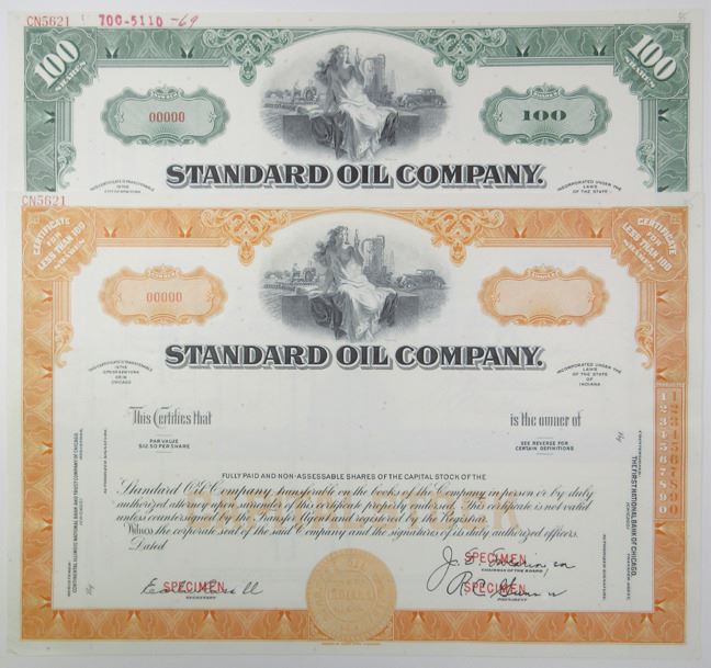 Indiana. Pair of Specimen Stock Certificates One in green for 100 Shares and the other in orange for <100 Shares. Both have Specimen overprints, POCs, and are in VF-XF condition, ABNC.