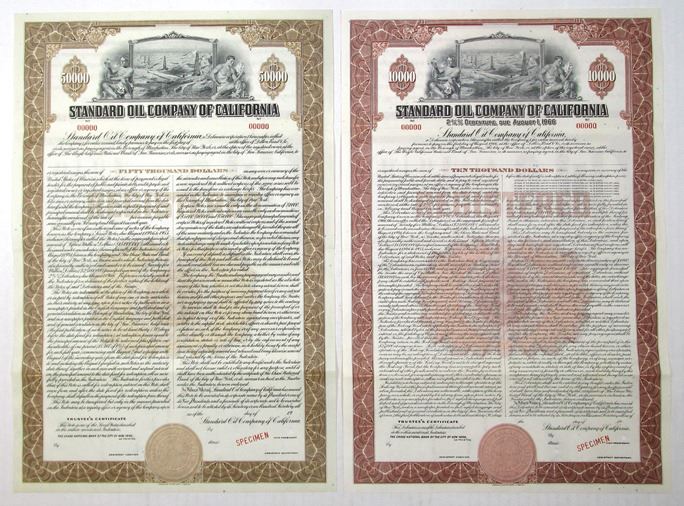 New Jersey, 1926. Lot of 2 Registered Twenty Five Year 5% Gold Debenture Specimen Bonds in different colors and denominations, includes: $1000 in Brown, $5000 in Blue, and $10,000 in Blue. All have gushing oil well at top, Specimen overprints and POCs, are in Fine to VF+ condition, and printed by ABNC. (3). Sold "AS IS" no returns accepted.