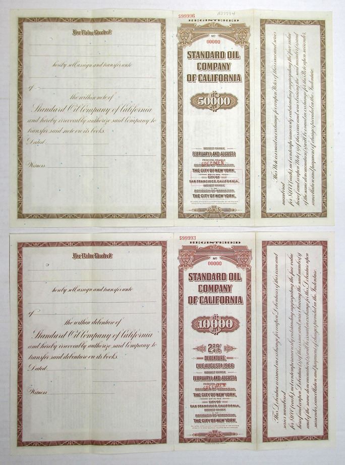 New Jersey, 1926. Lot of 2 Registered Twenty Five Year 5% Gold Debenture Specimen Bonds in different colors and denominations, includes: $1000 in Brown, $5000 in Blue, and $10,000 in Blue. All have gushing oil well at top, Specimen overprints and POCs, are in Fine to VF+ condition, and printed by ABNC. (3). Sold "AS IS" no returns accepted.
