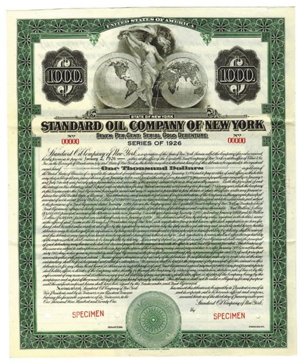New York. $1000 Specimen 7% Serial Gold Debenture Coupon Bond, Black print on green border and under tint, Allegorical woman at top between hemispheres of the globe, Specimen overprints and POC's, VF-XF condition, ABNC.