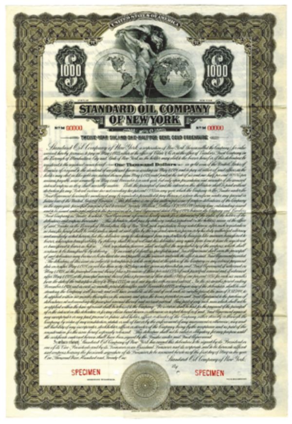 New York. $1000 Specimen 6 1/2% Gold Debenture Coupon Bond, Black print on brown border and under tint, Allegorical figure at top between two hemispheres of the globe, Specimen overprints and POC's, Fine-VF condition with minor toning along fold lines, ABNC.