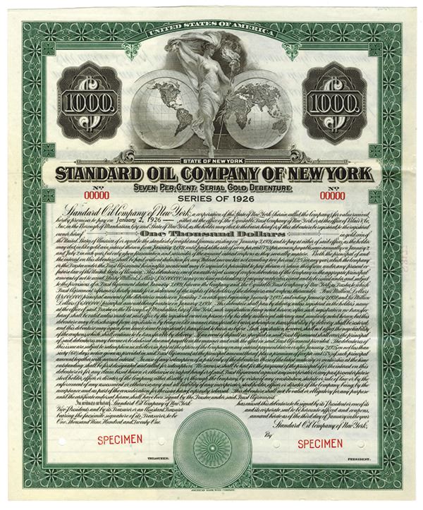 New York. $1000 Specimen 7% Serial Gold Debenture Coupon Bond, Black print on green border and under tint, Allegorical woman at top between hemispheres of the globe, Specimen overprints and POC's, VF-XF condition, ABNC.