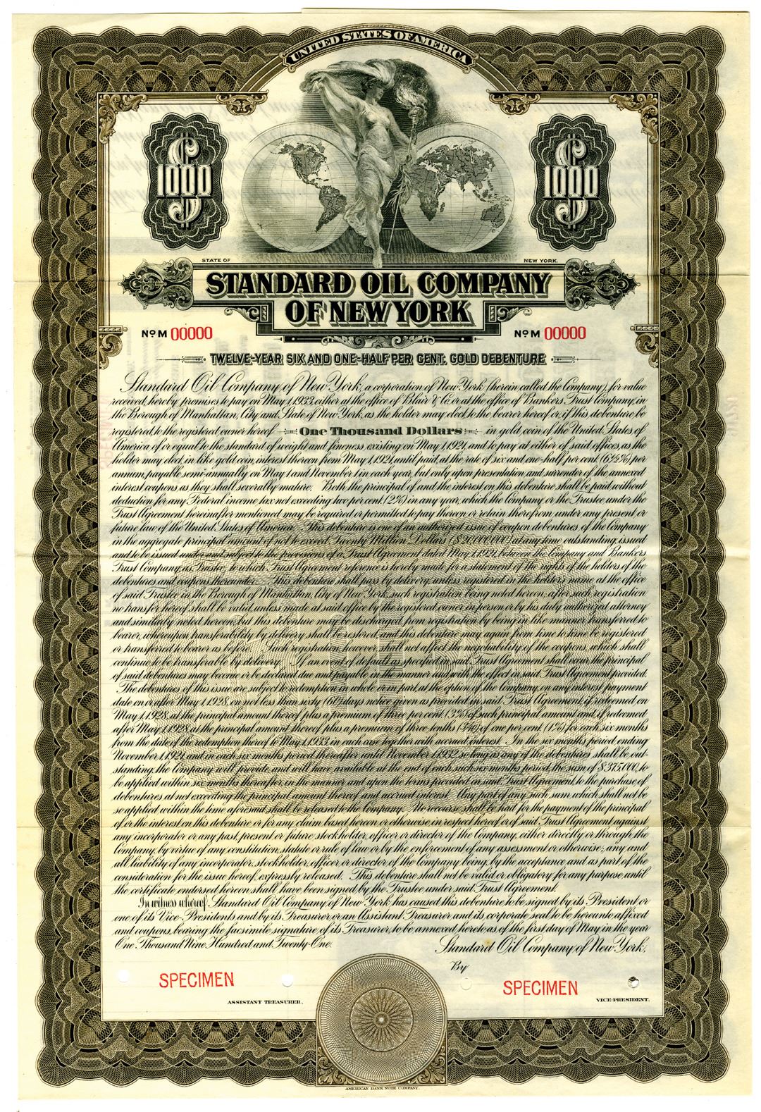 New York, 1921. $1000 Specimen 6.5% Debenture Gold Coupon Bond, Black text with brown border and undertint, Allegorical woman with two halves of a globe at top center. Red specimen overprints, 00000 serial numbers, and POCs. VF condition, ABNC.