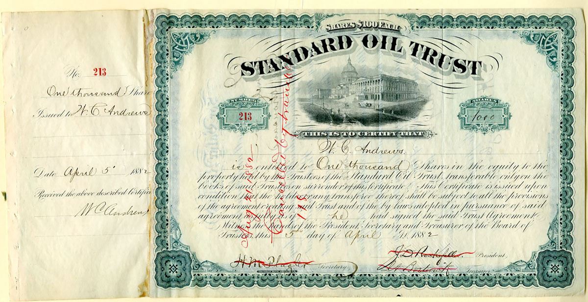 New York, April 5, 1882. 1000 Shares I/C Stock Certificate Issued to W. C. Andrews, S/N 213. Black text with green border, U.S. Capitol Building at top center. Signatures have been cancelled. VF condition with signs of wear along top margin, FBN. Signatures are: J. D. Rockefeller as President; J. A. Bostwick as Treasurer; signed by H. M. Flagler twice as Secretary, and ITASB, W.C. Andrews, who also signed the back. Very rare set of signatures. Wallace Corydon Andrews was born in Vienna, Ohio 17 June 1833. He was one of the original directors of the Standard Oil Company, and in 1879 became President of the New York Steam Company. John Davison Rockefeller (July 8, 1839 - May 23, 1937) was the guiding force behind the creation and development of the Standard Oil Company, which grew to dominate the oil industry and became one of the first big trusts in the United States. The Standard Oil Company was organized in 1870, with Henry Morrison Flagler (January 2, 1830 - May 20, 1913) and Jabez Abel Bostwick (September 23, 1830 - August 16, 1892) serving as founding members, alongside J.D. Rockefeller. Rockefeller is widely considered the wealthiest American of all time and the richest person in modern history. Standard Oil Co. was an American oil-producing, transporting, refining, and marketing company. Standard Oil's history as one of the world's first and largest multinational corporations ended in 1911, when the U.S. Supreme Court ruled, in a landmark case, that Standard Oil was an illegal monopoly. Rare and valuable set of signatures from influential and famous American businessmen.