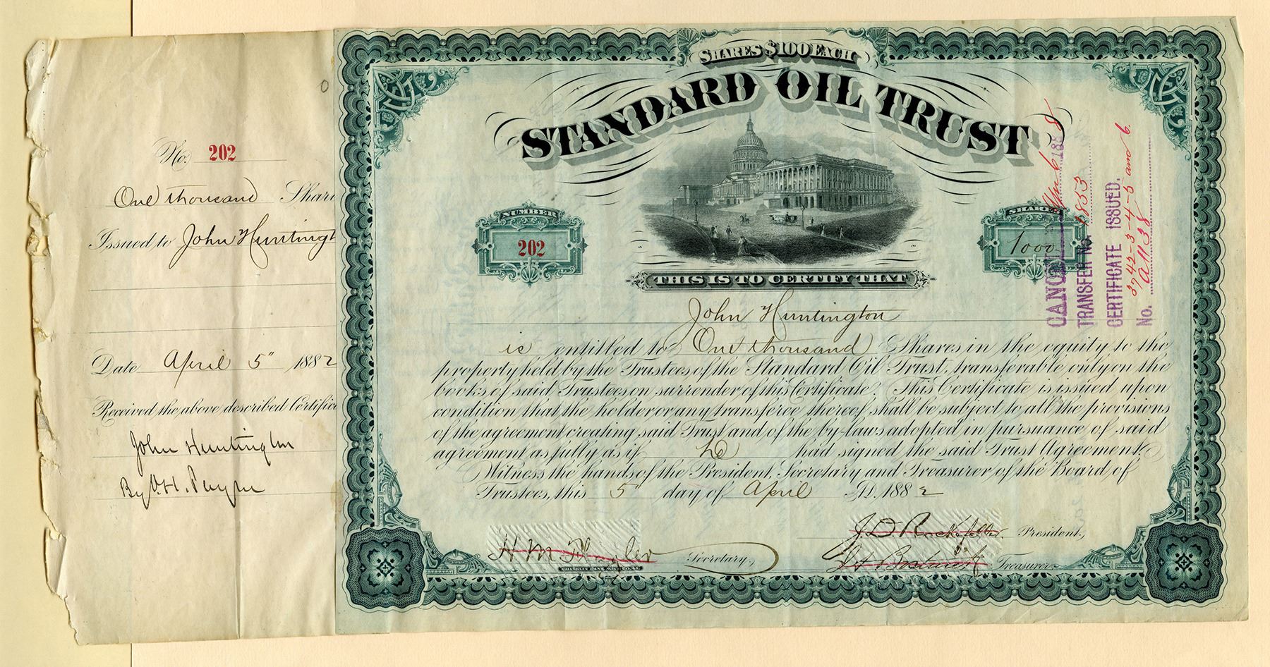 New York, 1882. Standard Oil Trust Certificate, I/C Stock Certificate, Signed by William Payne, Flagler, Bostwick and J. D. Rockefeller, VF to XF condition. Press Cancelled, S/N 202, Black text with green border, U.S. Capitol Building at top center. Signatures have been cancelled. FBN. Signatures are: J. D. Rockefeller as President; J. A. Bostwick as Treasurer; H. M. Flagler as Secretary. Very rare set of signatures. Jabez Abel Bostwick (September 23, 1830 - August 16, 1892) was an early oil pioneer and magnate, and when John D. Rockefeller formed the Standard Oil Company, Mr. Bostwick aided in its organization and became its first Treasurer. John Davison Rockefeller (July 8, 1839 - May 23, 1937) was the guiding force behind the creation and development of the Standard Oil Company, which grew to dominate the oil industry and became one of the first big trusts in the United States. He is widely considered the wealthiest American of all time and the richest person in modern history. Standard Oil was an American oil-producing, transporting, refining, and marketing company. Its history as one of the world's first and largest multinational corporations ended in 1911, when the U.S. Supreme Court ruled, in a landmark case, that Standard Oil was an illegal monopoly. Historic piece with a valuable quartet of signatures from historic American businessmen.