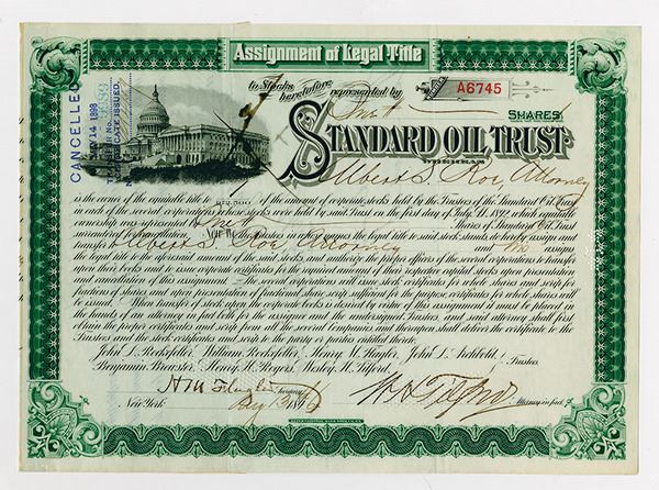 Ohio....August 13, 1896, 1 Share, I/C, Black on green border, U.S. Capital on upper left, S/N A6745, Signed by H.M. Flagler as Secretary and W.H. Tifford as attorney in fact. VF condition. International BNC. Standard Oil's pre-history began in 1863 as an Ohio partnership formed by industrialist John D. Rockefeller, his brother William Rockefeller, Henry Flagler, chemist Samuel Andrews, silent partner Stephen V. Harkness, and Oliver Burr Jennings, who had married the sister of William Rockefeller's wife. In 1870, Rockefeller abolished the partnership and incorporated Standard Oil in Ohio. Of the initial 10,000 shares, John D. Rockefeller received 2,667; Harkness received 1,334; William Rockefeller, Flagler, and Andrews received 1,333 each; Jennings received 1,000, and the firm of Rockefeller, Andrews & Flagler received 1,000. Rockefeller chose the "Standard Oil" name as a symbol of the reliable "standards" of quality and service that he envisioned for the nascent oil industry.