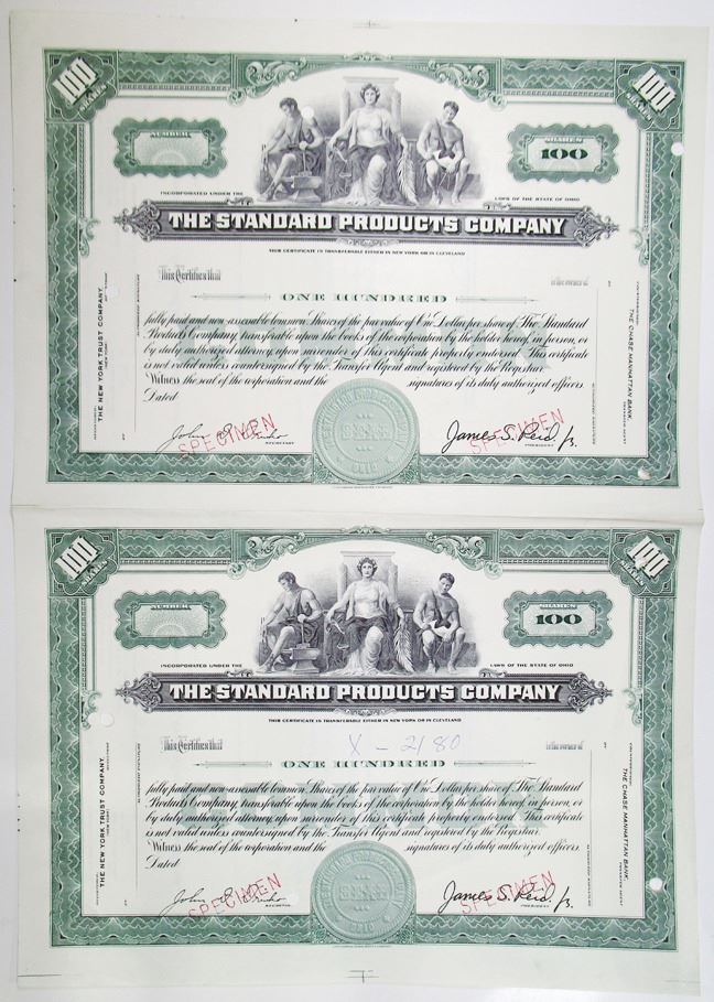 Ohio, ND (1950-1960s). Uncut sheet of 2 stock certificates, both: 100 Shares Specimen Stock Certificates, Black text with green border and underprint, Allegorical woman on throne flanked by allegorical men. Red specimen overprints and POCs. VF condition. One has writing at center in ink. The Standard Products Company was acquired by Cooper Tire & Rubber Co and integrated to form Cooper-Standard Automotive Inc. The Company manufactured sealing, trim, and vibration control systems for the automotive original equipment industry. (2 uncut)