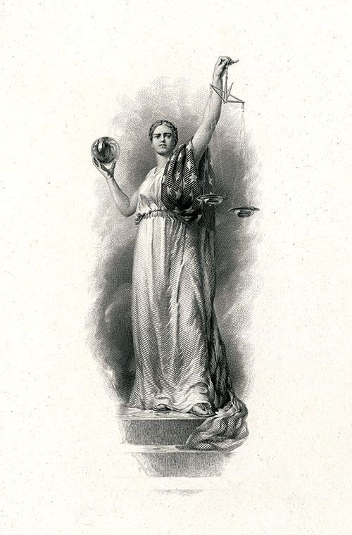 Washington, D.C., ND (ca. 1900-1920), 8 x 10.5 inches, engraved portrait of Standing Justice with scales, U.S. flag and holding glass globe, india printed on large card, elegant and very possibly a Smillie engraving, the back bares blue BEP number 1014343. AU to Uncirculated. BEP.