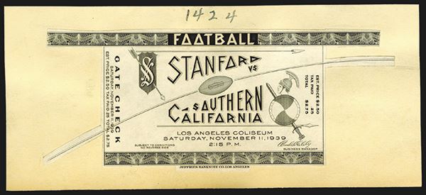 Los Angeles, CA., November 11, 1939 dated ticket, Black printed on white paper mounted on thin off white card, USC Trojan at lower right and Stanford logo with arrow on upper left, the ticket cost $2.75, Rare and possibly unique proof impression from Jeffries Banknote Company archives, Numbered on top margin, XF condition. JBNC.