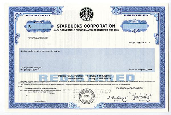 Washington, 2003. $Odd Specimen 4.5% Registered Convertible Subordinated Debenture Bond, Black text with blue border and underprint, Starbucks logo at top center. Specimen POCs, XF condition, SC-USBN. Starbucks Corporation is an American multinational chain of coffeehouses and roastery reserves headquartered in Seattle, Washington. As the world's largest coffeehouse chain, Starbucks is seen to be the main representation of the United States' second wave of coffee culture.