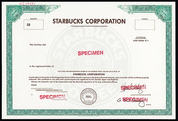 Washington, 1986 (ca. 1986-1992), Odd Shares, Specimen Stock Certificate, Brown title and text with green border and underprint, Large Starbucks Logo underprint vignette. Red "SPECIMEN" overprints. Choice uncirculated condition. Scarce stock certificate that may very well be their IPO issue from a popular company. SCBNC. Shultz facsimile signature.