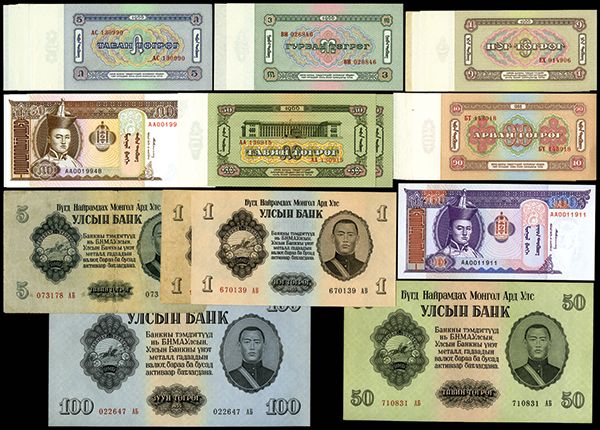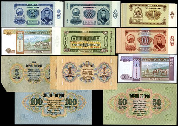 State Bank, 1955-2000, Group of 37 Mongolia, lot of 37, includes 1 Tugrik, P-28 (2 pcs); 5 Tugrik, P-30; 50 Tugrik, P-33, UNC; 100 Tugrik, P-34, UNC; the rest mostly 1-, 3-, 5-, 10-, and 50 Tugrik notes from the 1966 and 1983 issues, in addition to 50 and 100 Tugrik of the 2000 issue.