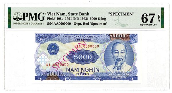 Viet Nam. Specimen 5000 Dong, 1991 (1993), P-108s. Blue on m/c, Specimen overprint, S/N AA 0000000, PMG graded Superb Gem Unc 67 EPQ (Cert # 1956589-019). Only one other note is graded higher in the PMG census out of 21 graded. This is the highest graded note offered at auction over the last 7 years.