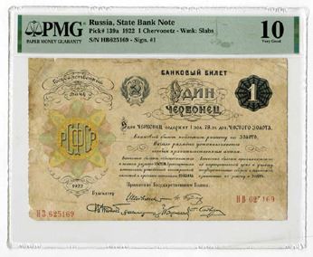 Russia, 1922. 1 Chervonetz, P-139a, Issued Banknote, Dark blue and m/c printing with State Emblem at left, S/N HB625169, PMG graded Very Good 10 with comments "Paper Damage, Corner Added."
