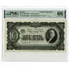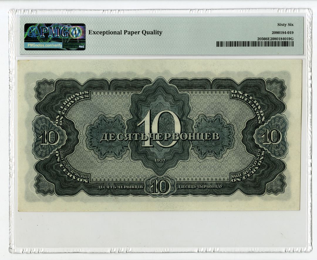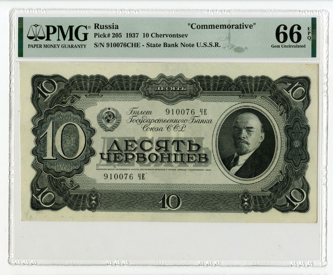 Russia. 1937. 10 Chervontsev, P-205, issued commemorative banknote, Portrait of V. Lenin at right, Olive-gray green, S/N 910076, PMG Graded Gem Uncirculated 66 EPQ. Tied with 4 other notes as highest graded out of 41 graded in the PMG census. This lovely note will be impossible to improve upon.