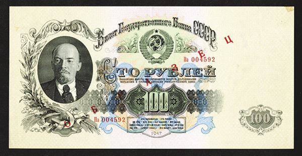Russia - USSR. 1947. P-232s. Lenin at left. Kremlin on back. Overprinted in red on both sides. Stain at top right corner. Extremely Fine.
