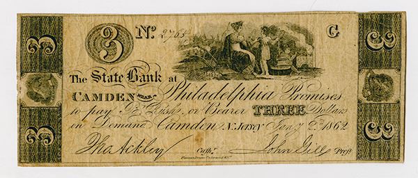 Camden, NJ. $3, Jan. 2, 1862, Wait 335, R-5. VG-Fine, The State Bank at Camden was one of the pillars of early banking in New Jersey. Formed in 1812, it received a National charter in 1865, eventually becoming the First Camden National Bank & Trust. This is a spurious note similar to Wait #332, with a Leney & Rollinson imprint. This note has the Fairman, Draper Underwood & Co. imprint, and is dated January 2, 1862. Black printing, with a maiden and child vignette.