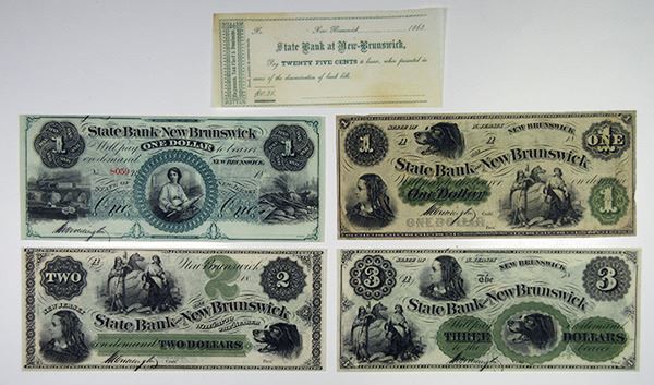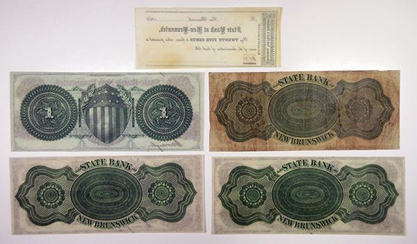 New Brunswick, NJ. Lot of 4 Notes, Includes 25 cents, Hagaman, Van Cleef & Dunham's; $1, $2, $3, 1862, Wait 1675, 1681, 1682, 1689, 1696, R-2, R-6. Fine to AU condition. (4)