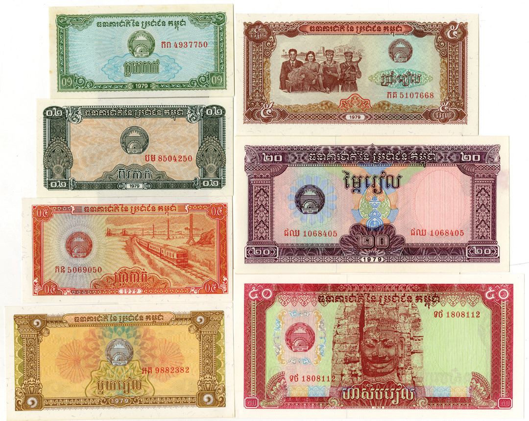 Cambodia..., 1979. Collection of Issued Banknotes including 0.1 Riel (1 Kak), P-25a; 0.2 Riels (2 Kaks), P-26a; 0.5 Riels (5 Kaks), P-27a; 1 Riel, P-28a; 5 Riels, P-29a; 20 Riels, P-31a; 50 Riels, P-32a. Notes range from XF to Unc condition. (7). Sold "AS IS" no returns accepted.