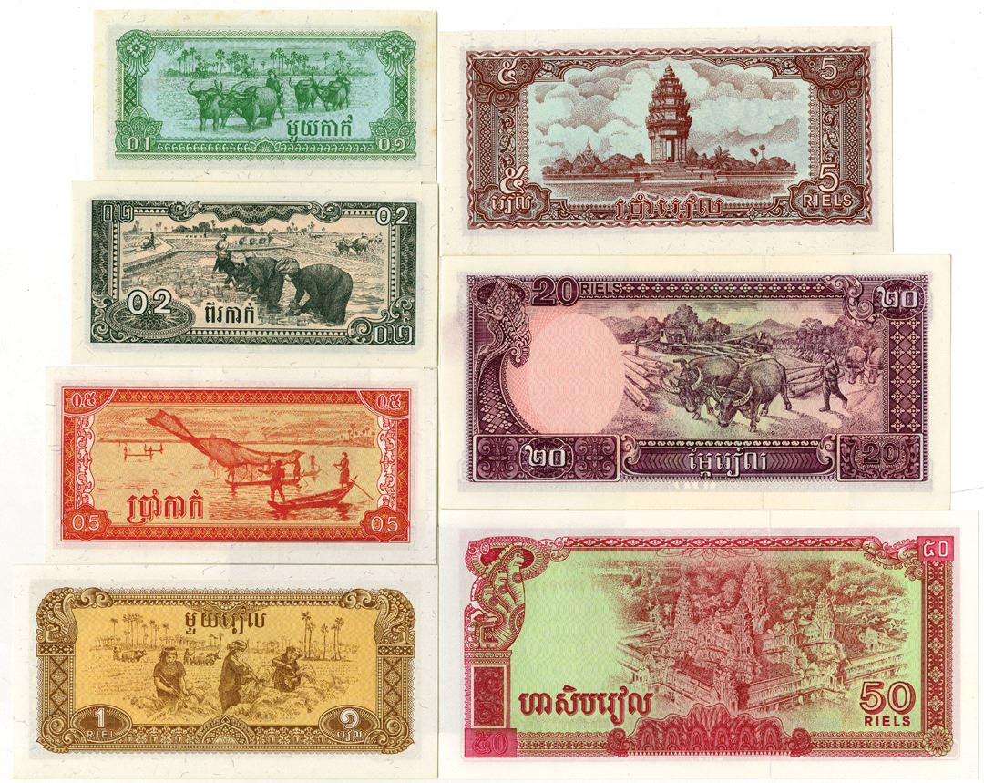 Cambodia..., 1979. Collection of Issued Banknotes including 0.1 Riel (1 Kak), P-25a; 0.2 Riels (2 Kaks), P-26a; 0.5 Riels (5 Kaks), P-27a; 1 Riel, P-28a; 5 Riels, P-29a; 20 Riels, P-31a; 50 Riels, P-32a. Notes range from XF to Unc condition. (7). Sold "AS IS" no returns accepted.