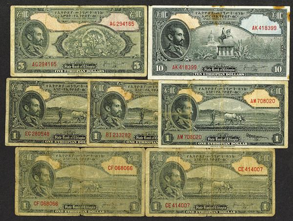 Ethiopia. 1, 5, 10 Dollars. P-12a, b (4); 13b; 14b. Haile Selassie at left on all. Very Good to Fine, the 10 is Very Fine with stains. 7 pieces.
