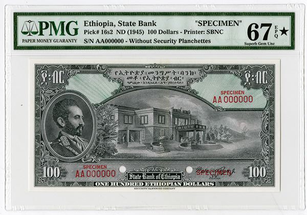 Ethiopia, ND (1945). $100, P-16s2, Specimen, red serial numbers and POC's, Signature of Rozell Jr., PMG graded Superb Gem Uncirculated 67 EPQ*. Rare high denomination note in high grade. SBNC. Possibly the finest known in the PMG census.