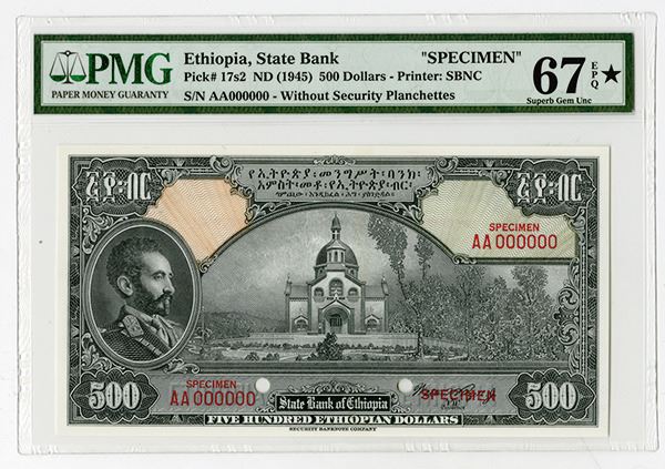 Ethiopia, ND (1945). $500, P-17s2, Specimen, red serial numbers and POC's, Signature of Rozell Jr., PMG graded Superb Gem Uncirculated 67 EPQ*. Rare high denomination note in high grade. SBNC. Possibly the finest known in the PMG census.