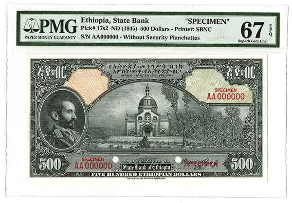 Ethiopia, ND (1945). $500, P-17s2, Specimen, red serial numbers and POC's, Signature of Rozell Jr., PMG graded "67 - Superb Gem Unc. - EPQ (Exceptional Paper Quality)". Rare high denomination note in high grade. SBNC. Tied with one other note for finest known in the PMG census.