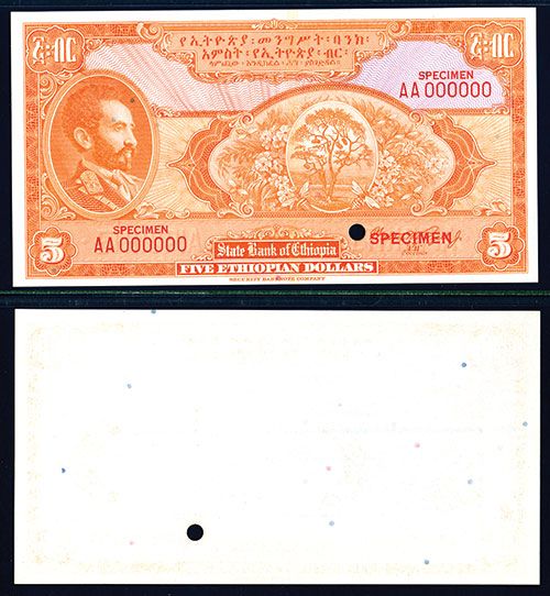 ND (ca.1945). $5, P-13cts Unlisted Trial Color, Orange on m/c instead of issued black on m/c, Red specimen overprints, “00000” serial numbers and POC's. Back is blank. PMG graded Gem Uncirculated 66 EPQ, SBNC. Rare trial color note. Only 4 graded by PMG with only one graded higher.