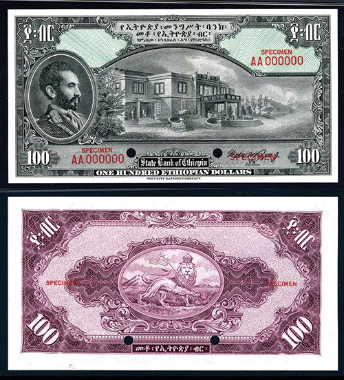 Ethiopia, ND (1945), $100, P-16s, Specimen banknote, Black on green and m/c, Building on face, back with arms, S/N “AA00000”, Specimen overprint and POC's, PMG graded “66 Gem Uncirculated - EPQ (Exceptional Paper Quality)”, superb note that will enhance any high quality collection. SBNC.