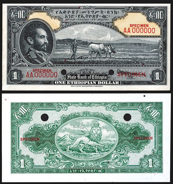 Ethiopia, ND (ca.1945). $1, P-12as Unlisted Uniface Front & Back Specimens. Unlisted as a specimen with Signature #1 of Blowers signature, Planchetted paper, overprinted Specimen on front and back and numbered with star on back. Black with light orange underprint, Haile Selassie on left with building in middle, back green. Uncirculated with light glue remnants on back from previous mounting. SBNC.