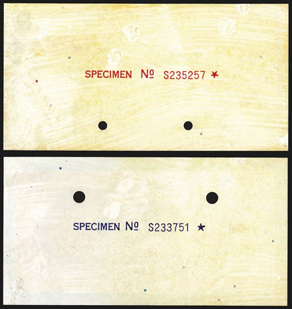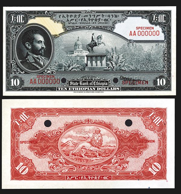 Ethiopia, ND (ca.1945). $10, P-14as Unlisted Uniface Front & Back Specimens. Unlisted as a specimen with Signature #1 of Blowers signature, Planchetted paper, overprinted Specimen on front and back, numbered with star on back. Black with orange and blue underprint, Uncirculated with light glue remnants on back from previous mounting. SBNC.
