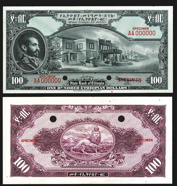 Ethiopia, ND (ca.1945). $100, P-16as Unlisted Uniface Front & Back Specimens. Unlisted as a specimen with Signature #1 of Blowers signature, Planchetted paper, overprinted Specimen on front and back, numbered with star on back. Black with green underprint, Portrait of Haile Selassie on left with building in middle, back maroon. Uncirculated with light glue remnants on back from previous mounting. SBNC.