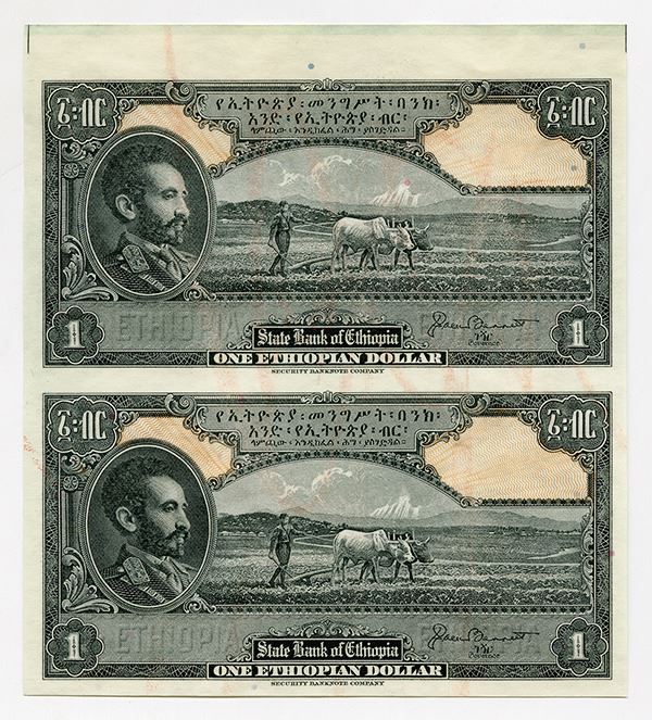 Ethiopia. Uncut sheet of 2 notes, 1 Ethiopian Dollar, ND (1945), P-12. With wide margin at top, no serial numbers, XF to AU condition with light crayon marks on the face. Virtually never seen in this form. SBNC.