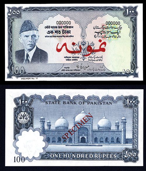 ND (1973-78), 100 Rupees, P-23 Unlisted Specimen, Dark Blue on m/c underprint, Mohamed Ali Jinnah at left, “Specimen No.77” on margin, Specimen overprints, Choice to Gem Uncirculated.