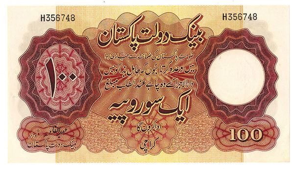 PakistanÉ.... Lot includes an issued 100 Rupees banknote, s/n H356748. P-14b. About to Choice Unc.