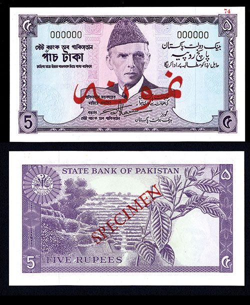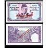 Pakistan, ND (1966), 5 Rupees, P-15 Unlisted Specimen, Purple on m/c underprint, Specimen overprint, S/N 000000 and “74” on upper right corner, Mohammed Ali Jinnah at center, Choice AU due to a very light diagonal fold that is difficult to view, rare as specimen.