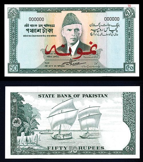 Pakistan, ND (1964), 50 Rupees, P-17b Unlisted Specimen, Blue-green on m/c underprint, Specimen overprint, S/N 000000 and “70” on upper right corner, Mohammed Ali Jinnah at center, rare as specimen.