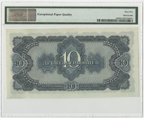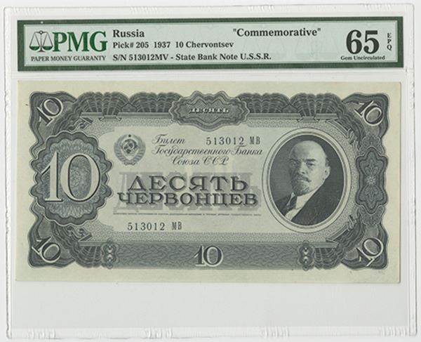 Russia. Issued 10 Chervontsa, 1937, P-205, commemorative issue. PMG graded Gem Unc 65 EPQ.
