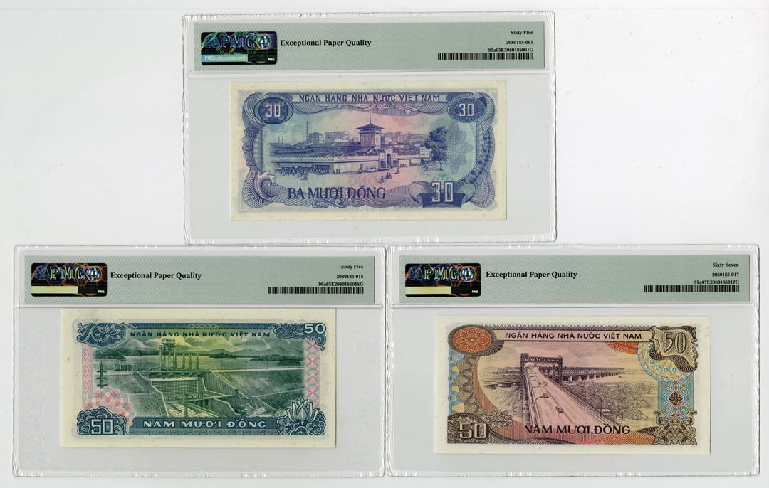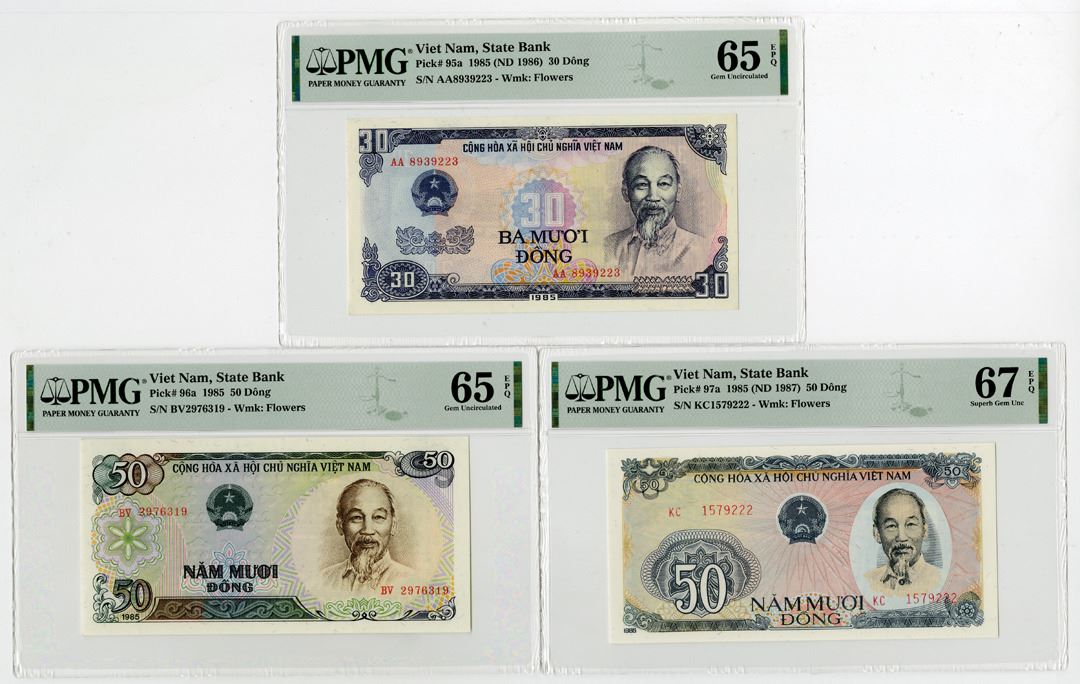 Viet Nam. 1985 (ND 1986-87). Lot of 3 Issued banknotes: 30 Dong, P-95a, PMG graded Gem Uncirculated 65 EPQ; 50 Dong, P-96a, PMG graded Gem Uncirculated 65 EPQ; and 50 Dong, P-97a, PMG graded Superb Gem Uncirculated 67 EPQ. (3)