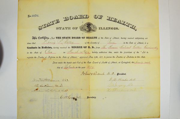IL. Diploma of the State Board of Health accepting the degree of Henry Filley of Peoria from the Miami Medical College in Cincinnati from 1873, to practice medicine in the State of Illinois starting in 1877. Toned center fold, slight paper separation at fold. Outer folded section on back very dark.